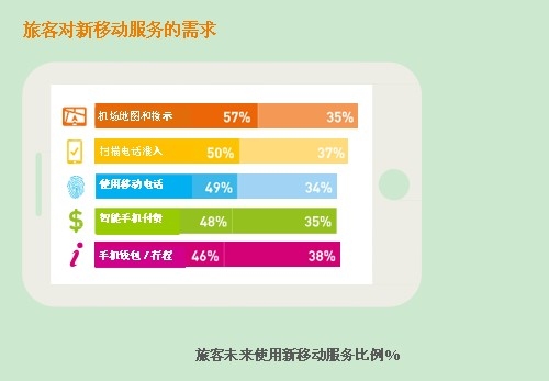 投資於移動服務不同地區的要求不同。半數非洲和美洲的旅客希望更多的服務,但是在亞太和歐洲對此的關注則大大降低,僅有三分之一的旅客認為這是優先的領域。