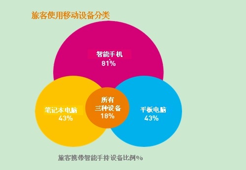 移動設備為旅行帶來的影響持續增長。今年的調查報告發現97%的旅客在旅行時攜帶一部手機,一部筆記本電腦或一部平板電腦。事實上,有18%的旅客會攜帶所有三種設備。