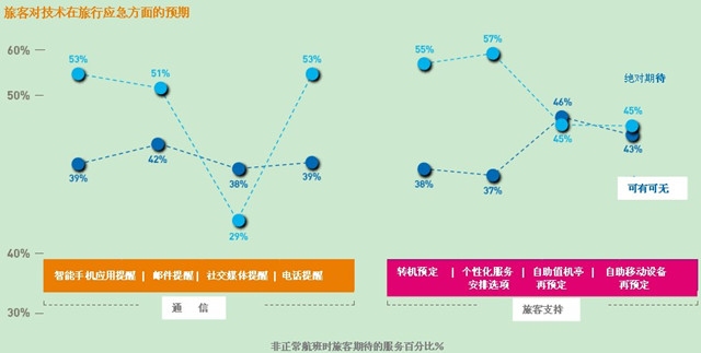 大部分旅客期待個性化更改航班,自動再定位來解決旅途中斷所帶來的影響。大部分旅客(45%)期待可以通過手機或值機亭進入自助服務選擇。