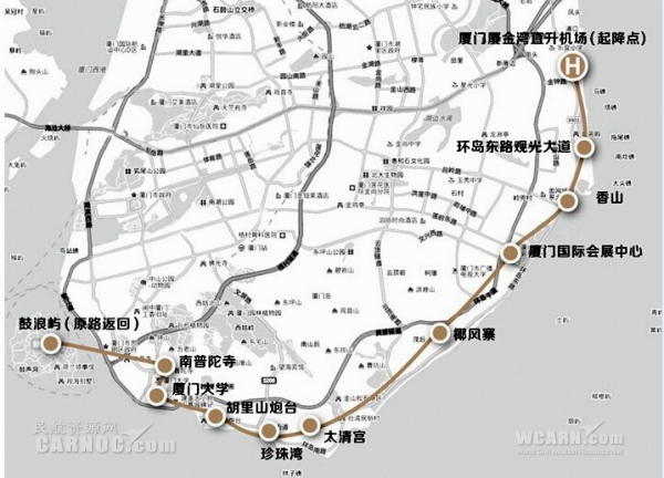 厦门空中游览采用的是意大利阿古斯特•韦斯特兰的AW109SP双发涡轴直升机。游览航线为厦金湾直升机场—环岛东路观光大道—香山—厦门国际会展中心—椰风寨—太清宫—珍珠湾—胡里山炮台—厦门大学—南普陀寺—鼓浪屿等,全程约40公里,飞行时间20分钟。如选择包机方式飞行,折合单人票价约950元。自2013年2月航线开通以来已累计接待游客约2800人。