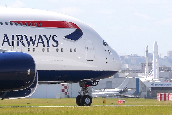 圖:在巴黎近郊的布爾歇機場,一架英航空客A380著陸後滑行