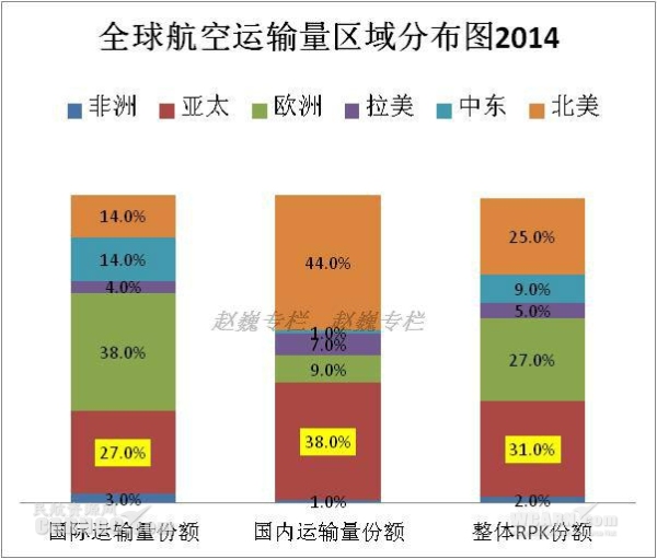 2014年全球航空量區域分佈情況見下圖1。亞太、歐洲和北美是全球最大的三大市場。國際航空運輸市場,歐洲最大份額高達38%;國內航空市場北美最大,份額高達44%;整體而言亞太航空運輸市場最大,份額高達31%。