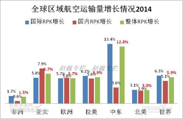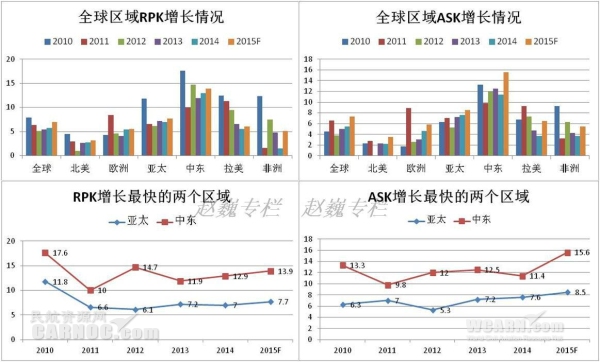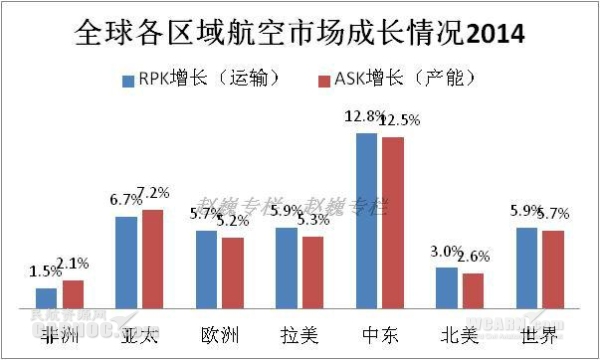 2014年全球各區域航空市場增長情況見下圖2。從航空運輸量(RPK)和運輸產能(ASK)兩方面看,中東地區以兩位數的增長率成為全球航空運輸增長最快的區域。亞太高於世界平均水準;歐洲和拉美略低於世界平均水準;北美和非洲低於世界平均水準。