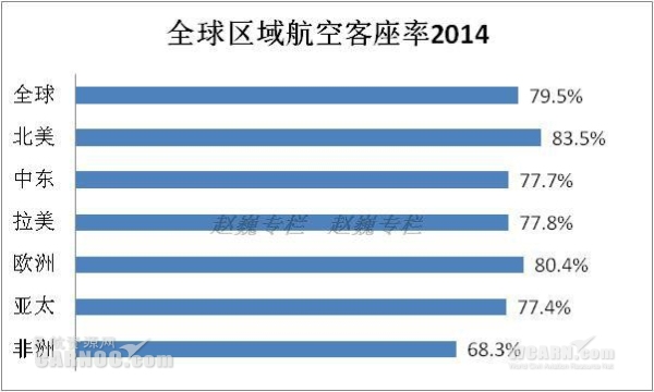 航空運力方面(以可用座公里或ASKs計)2014年全球整體航空運輸能力上升了5.7%。整體客座率維持與2013年相當的水準,為79.5%。北美洲承運人2014年的客座率最高,達83.5%,其後是歐洲的承運人,達80.4%。見下圖4。
