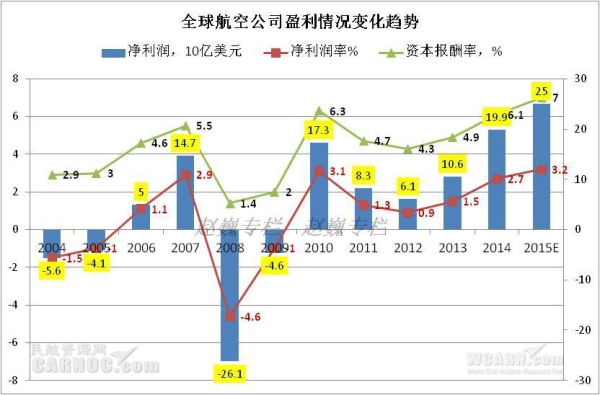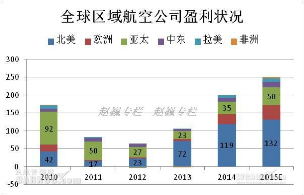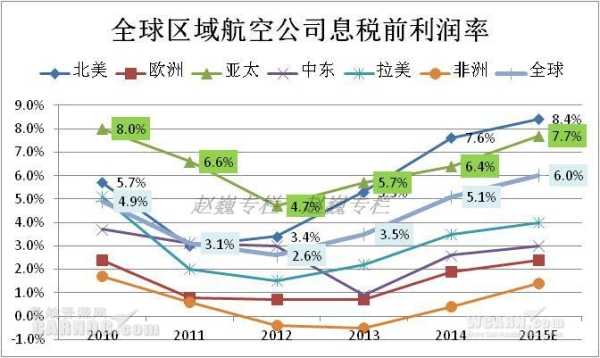 2014年全球航空公司息稅前利潤率達到5.1%,預計2015年達到6%,處於經濟危機後的最高水準。2014年亞太航空公司息稅前利潤率達到6.4%,預計2015年達到7.7%;北美航空公司2014年息稅前利潤率達到7.6%,預計2015年達到8.4%。