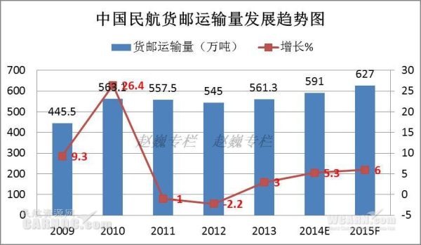 從全球航空貨運發展趨勢圖看,預計2014年全球航空貨運量達到5140萬噸,基於FTK的增長率為4.3%;2015年全球航空貨運量將達到5350萬噸,基於FTK的增長率為4.5%。