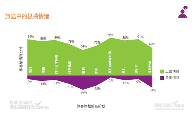 調查結果顯示,對大多數旅客而言,儘管安檢會讓他們感到沮喪,提取行李會在更大程度上降低他們的愉悅感,但旅行的絕大多數階段還是令人滿意的。事實上,36%的旅客會在安檢時出現負面情緒,而31%的旅客則會在提取行李時出現負面情緒。