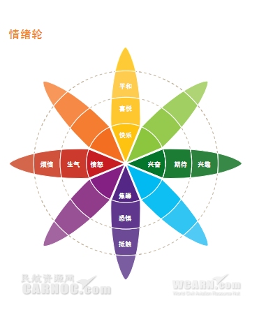 普拉奇克確定了8種主要情緒,我們從中挑選了4種用於本次調查,分別為:快樂、興奮、憤怒和焦躁。情緒強度增強時,指示顏色接近輪子的中心,而情緒強度減弱時,指示顏色靠近輪子的週邊。