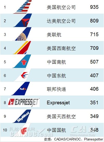 達美航空擁有809架飛機,美聯航擁有715架飛機。美國西南航空公司擁有709架飛機,排名第四。美西南同時也是全球規模最大的低成本航空公司。排名第7的聯邦快遞機隊有406架飛機,他也是全球機隊規模最大的快遞航空。