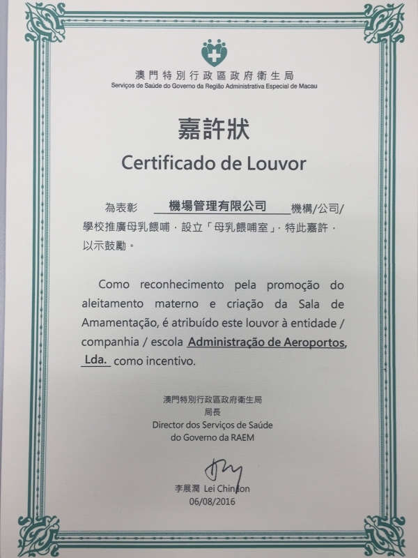 機場管理有限公司客戶服務部總監安杰奧先生代表接受這項榮譽 ,他認為嘉許狀是對機場服務的肯定。機場是社會公共設施,旅客各有不同的需要,澳門機場努力為所有旅客建設一個高效與舒適的環境,满足旅客需求。哺乳室是澳門國際機場的家庭友善設施,由2014年8月開始運作,裝置與設備都非常完善。安杰奧先生亦指出,使用澳門國際機場的家庭旅客有上升趨勢,其中本澳居民佔相當的比重。機場特設的哺乳室是配合澳門特區政府推廣母乳餵哺的政策,照顧與嬰幼兒同行的旅客需要。