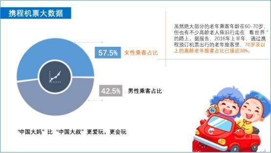 根據報告,2016年上半年,通過攜程預訂機票出行的老年旅客裏,女性乘客占57.5%,男性乘客占42.5%,女性乘客占比高於男性,也再次印證了“中國大媽”比“中國大叔”更愛玩,更會玩的事實。