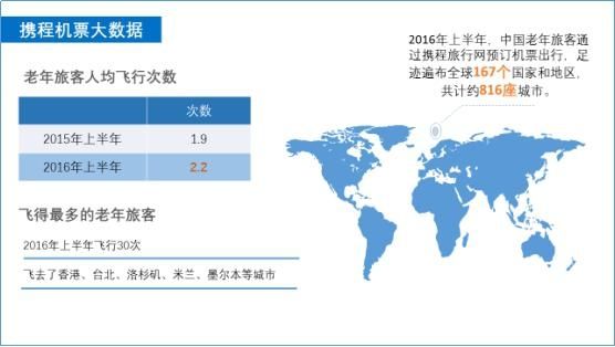 近日,攜程旅行網發布了一份關於年齡在60歲以上的老年旅客乘機報告,報告指出,2016年上半年,中國老年旅客通過攜程旅行網預訂機票出行,足跡遍布全球167個國家和地區,共計816座城市。