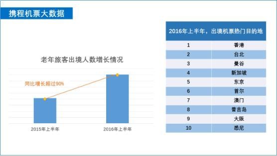 根據報告,2016年上半年,通過攜程預訂出境機票的老年旅客數量同比去年增長超過90%,這表明,越來越多的老年旅客不止於在境內旅遊,“世界那麼大”,他們也在踐行著出去看世界的夢想。
