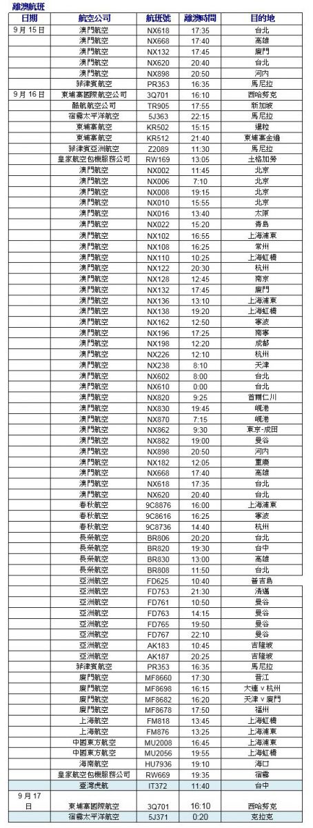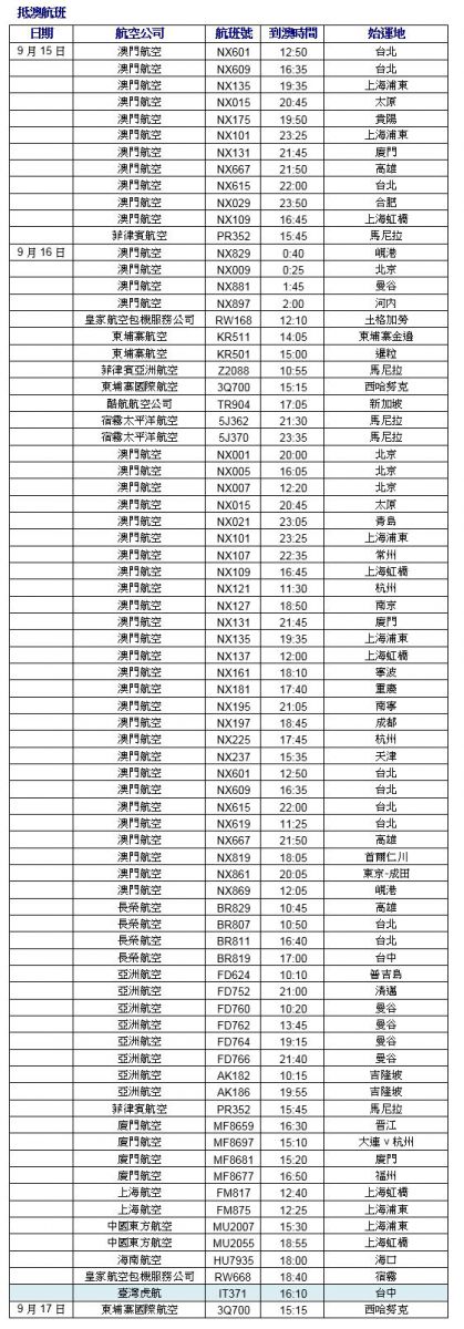 由於受到颱風“山竹”的影響,澳門國際機場通知乘客以下航班將會取消。乘客出發前請與相關的航空公司聯繋其航班的更新情況。