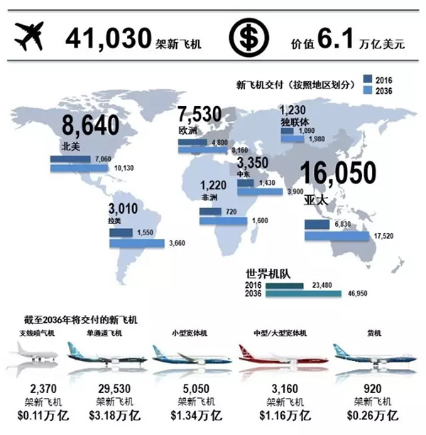 波音預測,未來20年全球將需要41030架新飛機,價值總計6.1萬億美元。