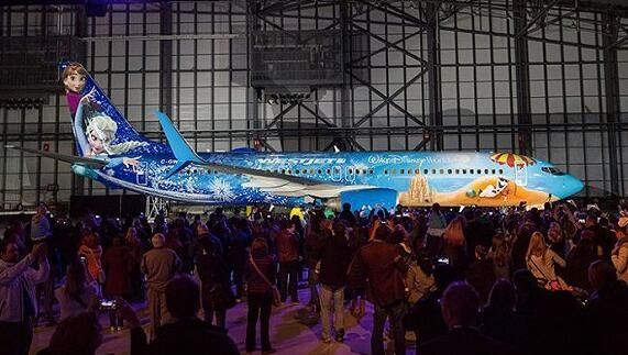 如果你想要在飛機上畫安娜、艾爾莎和奧拉夫等《冰雪奇緣》的人物,你將需要170加侖、23種不同顏色的顏料。加拿大的西捷航空就和迪士尼合作,請來了美國、加拿大、德國等國的畫家,完成了這個壯舉。而且“冰雪奇緣”的主題不僅體現在機艙外,也蔓延到了機艙內部。人們頭頂的艙內裝飾從機身後部的冷色調過渡到機身前部的暖色調。