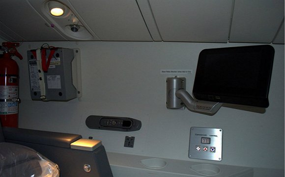 這個位於美航777上的休息區有一台電視。螢幕顯然比經濟艙乘客見到的大得多。