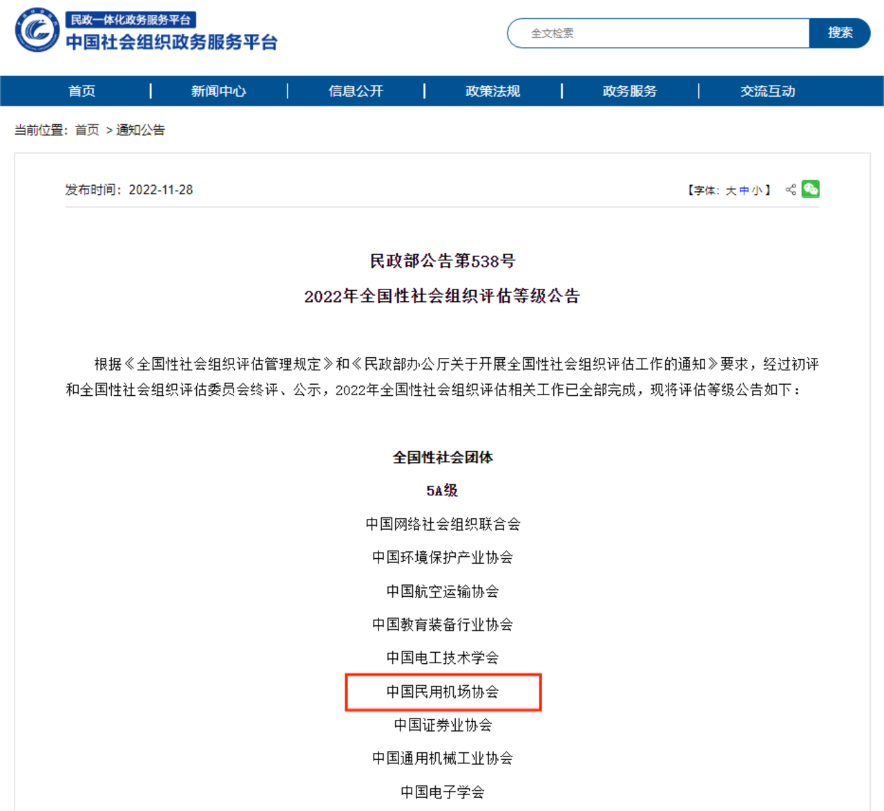 11月28日,民政部公布2022年全國性社會組織評估等級結果,中國民用機場協會被評為“5A級全國性社會團體”。這是繼2021年機場協會榮獲“全國先進社會組織”稱號後,獲得的又一殊榮。獲得這一榮譽得益于中央和國家機關工委、民政部和民航局等上級機關的關懷和指導,得益于全體會員單位的支持和幫助,得益于協會全體工作人員的努力和付出。