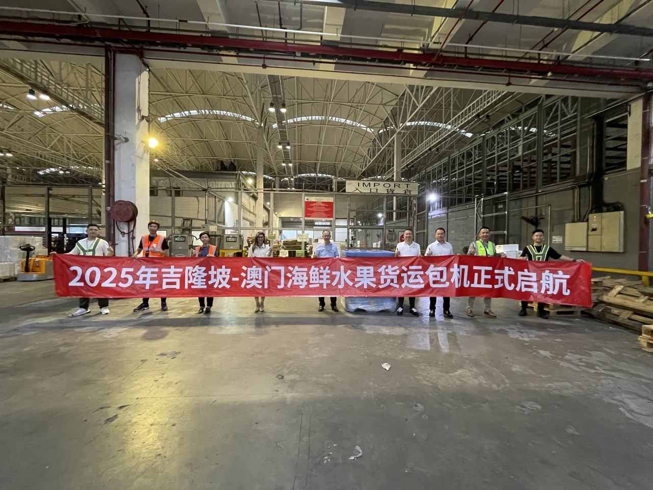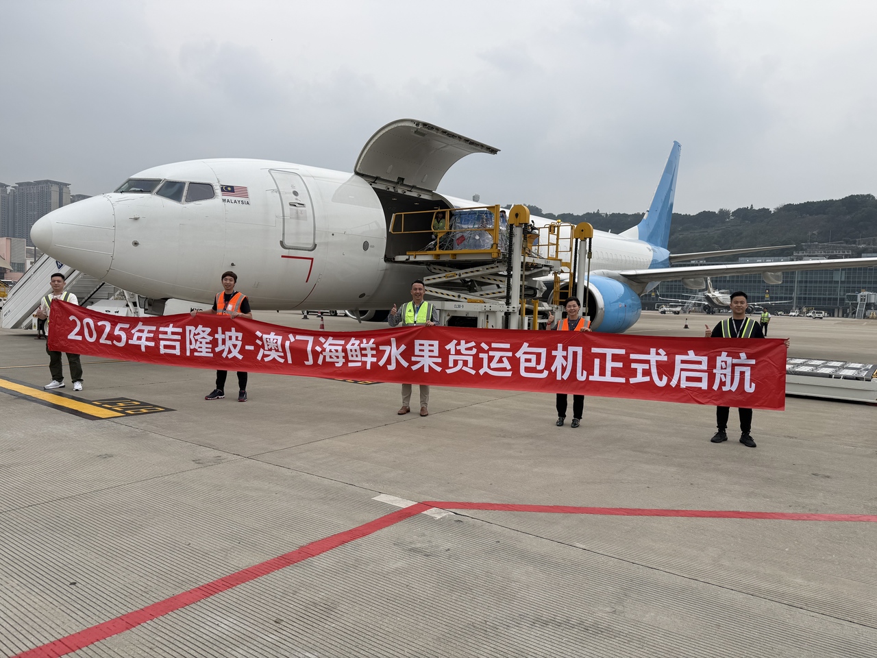2025年4月28日,澳門國際機場專營股份有限公司(CAM)執行董事李時泰先生出席馬捷航空(MJets Air) 開通吉隆坡至澳門海鮮水果貨運包機啟航儀式,該包機使用波音737系列全貨機執飛,每週營運12至14班次往返馬來西亞吉隆坡、澳門及菲律賓,澳門出發吉隆坡航班主要運輸跨境電商貨物,回程航班則運輸鮮活及水果等生鮮貨物。
